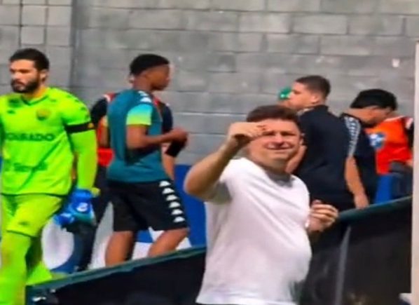 Após o apito final, imagens registraram um momento de tensão no gramado. Torcedores do Cuiabá confrontaram o dirigente, que respondeu com gestos provocativos, incluindo um sinal com a mão indicando “diminuição” e acenos de despedida em direção à arquibancada.