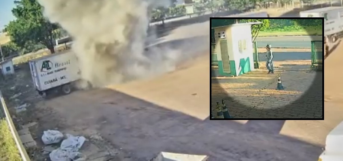 Câmeras do circuito interno de segurança registrou o momento em que um criminoso invadiu a empresa de transportes ALT Brasil e queimou um caminhão, em Cuiabá. O caso foi registrado na manhã desta quinta-feira (23).