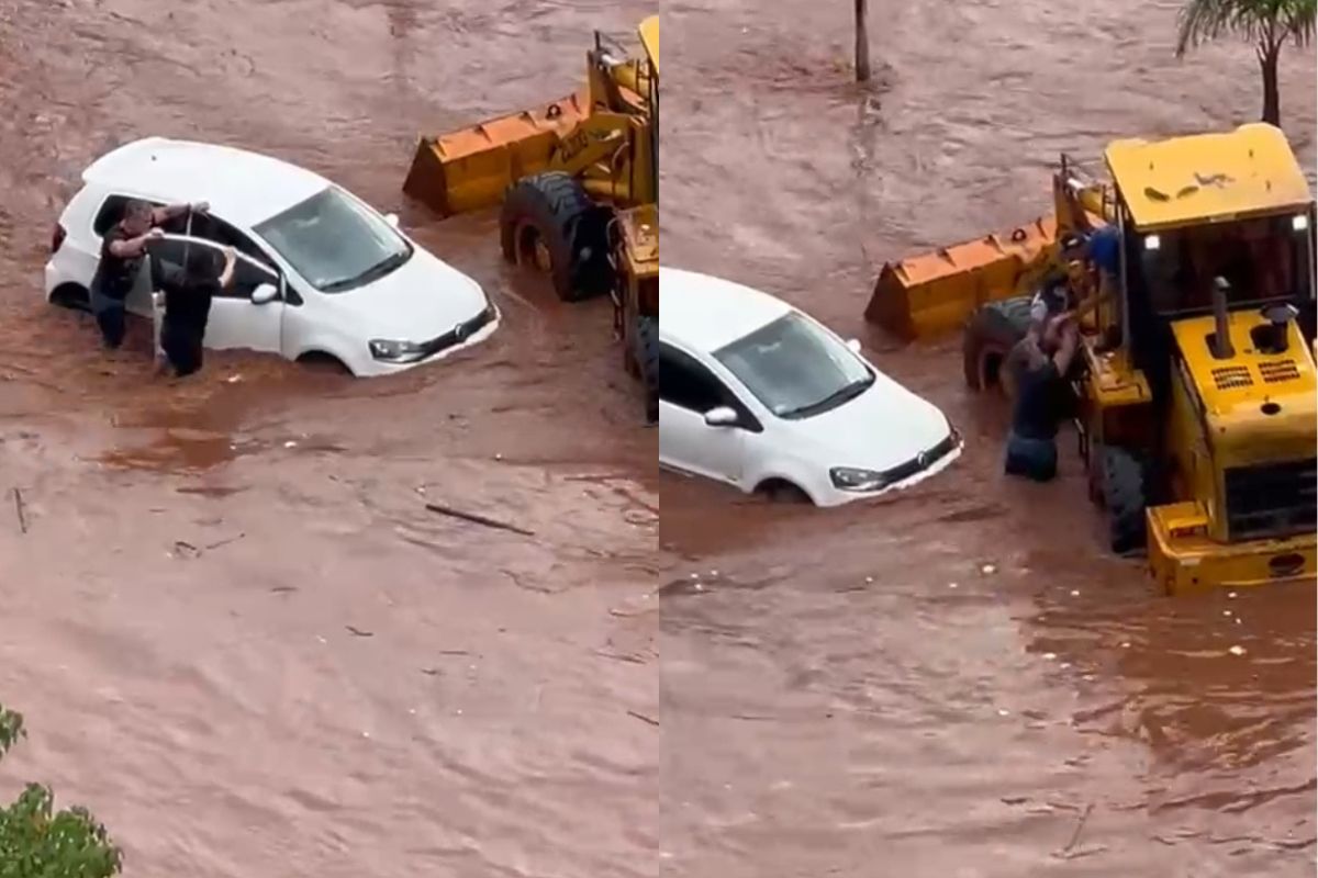 O homem que passava pelo local com uma retroescavadeira foi o responsável por retirar mãe e filha de dentro do carro, em um momento de forte correnteza e visibilidade reduzida na Rachid Neder.