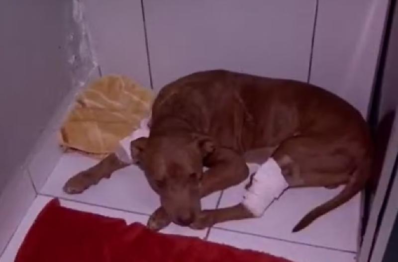 Conforme o boletim de ocorrência, a Polícia Militar foi acionada por volta das 16h após denúncia de que um animal havia sido enterrado vivo. No local, os policiais encontraram o pitbull extremamente debilitado, parcialmente soterrado, com uma lesão extensa na lateral do corpo.