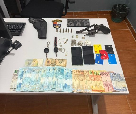 Com eles, policiais militares da 6º Companhia Independente apreenderam diversas porções de maconha, pasta base de cocaína, uma arma de fogo, munições e R$ 7.544 mil em espécie.
