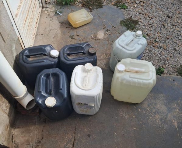 Em uma residência, foram encontrados recipientes contendo substâncias compatíveis com combustíveis.
