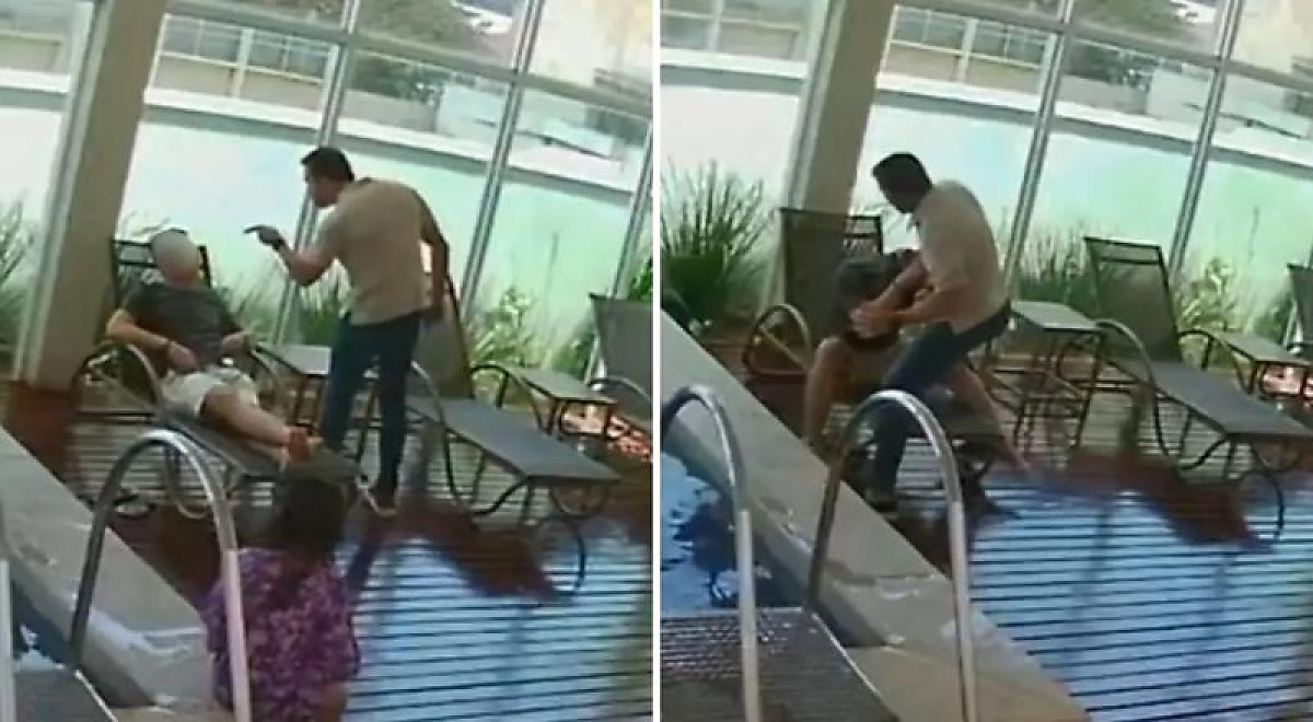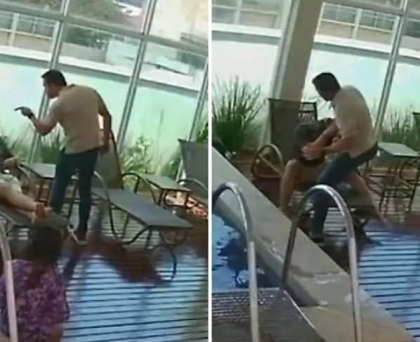 O vídeo, que circula nas redes sociais, mostra Rodolfo Ramos Caiado discutindo com o médico na área de lazer do prédio. Nas imagens, a vítima aparece sentada em uma cadeira, enquanto o advogado permanece em pé. Crianças acompanham a cena à distância, próximas à piscina.
