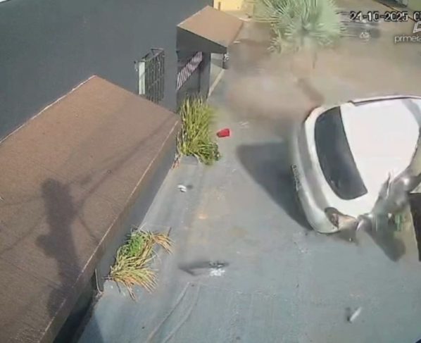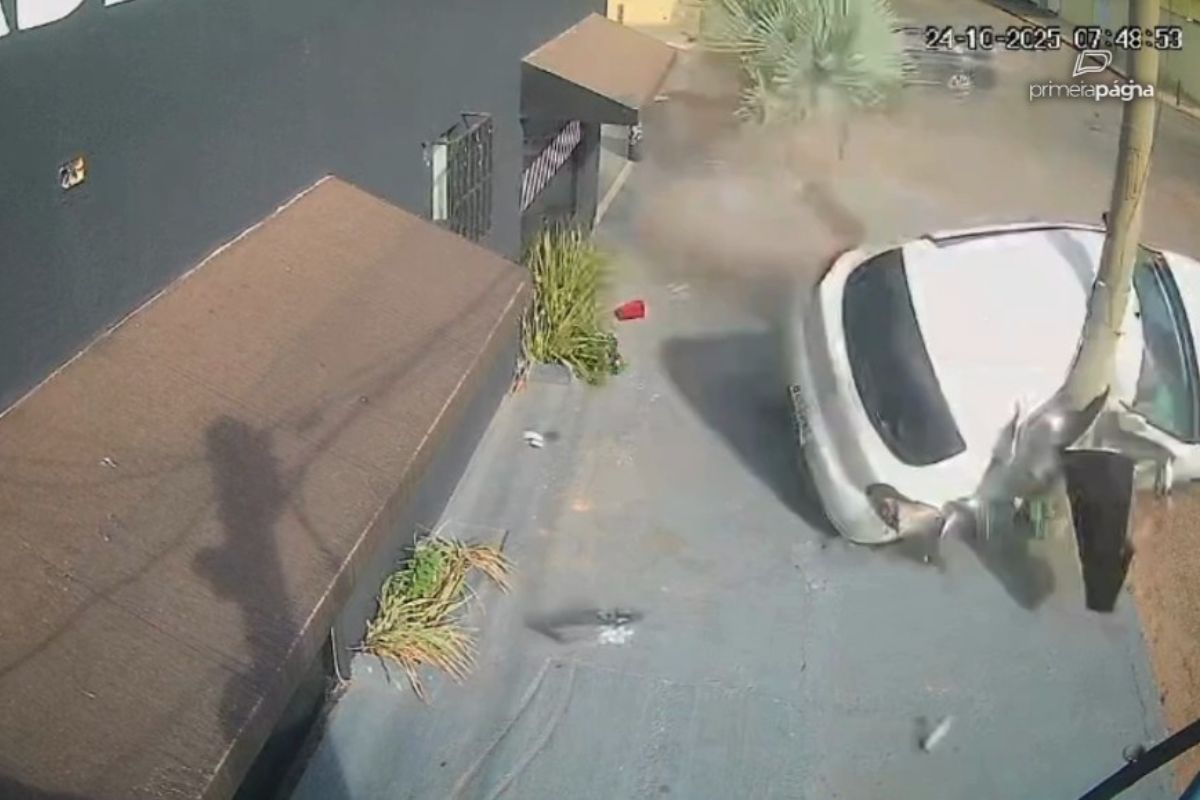 Nas imagens, é possível ver o carro se aproximando em alta velocidade, quando é atingido por outro veículo no cruzamento da Avenida Joinville com a Rua Petrolina. Com o impacto, o carro do casal capotou e atingiu poste de iluminação pública.