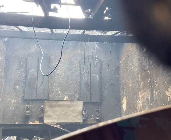 Mesmo após o controle do incêndio, os danos ficaram evidentes. Do lado de fora, é possível ver portas queimadas, paredes escurecidas pela fuligem e cinzas espalhadas pelo chão.